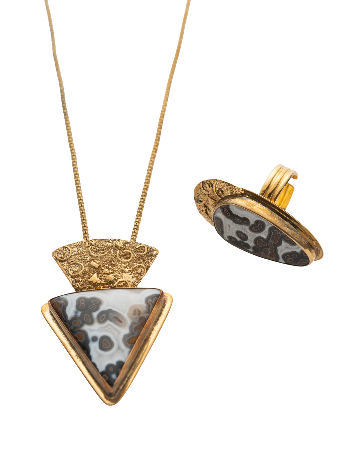 White-Brown Patterned Triangle and Oval Agate Necklace and Ring Set - 2100 7422